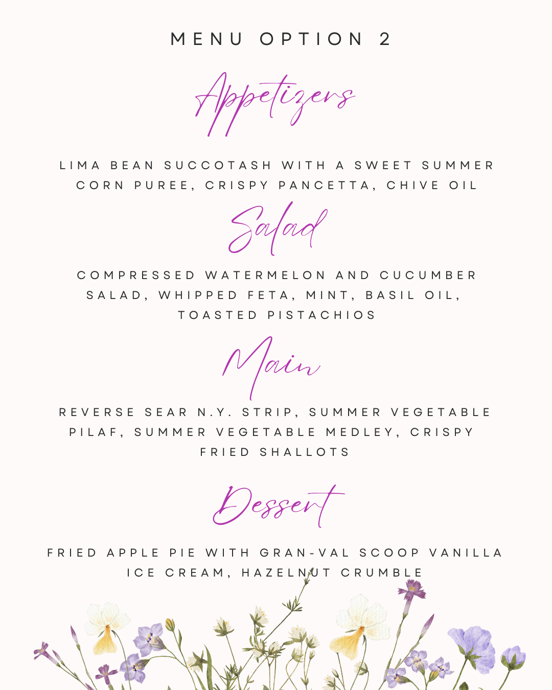 Private Chef Daniel Mahoney has curated three distinct menu options, allowing the winner to personalize this one-of-a-kind culinary experience.